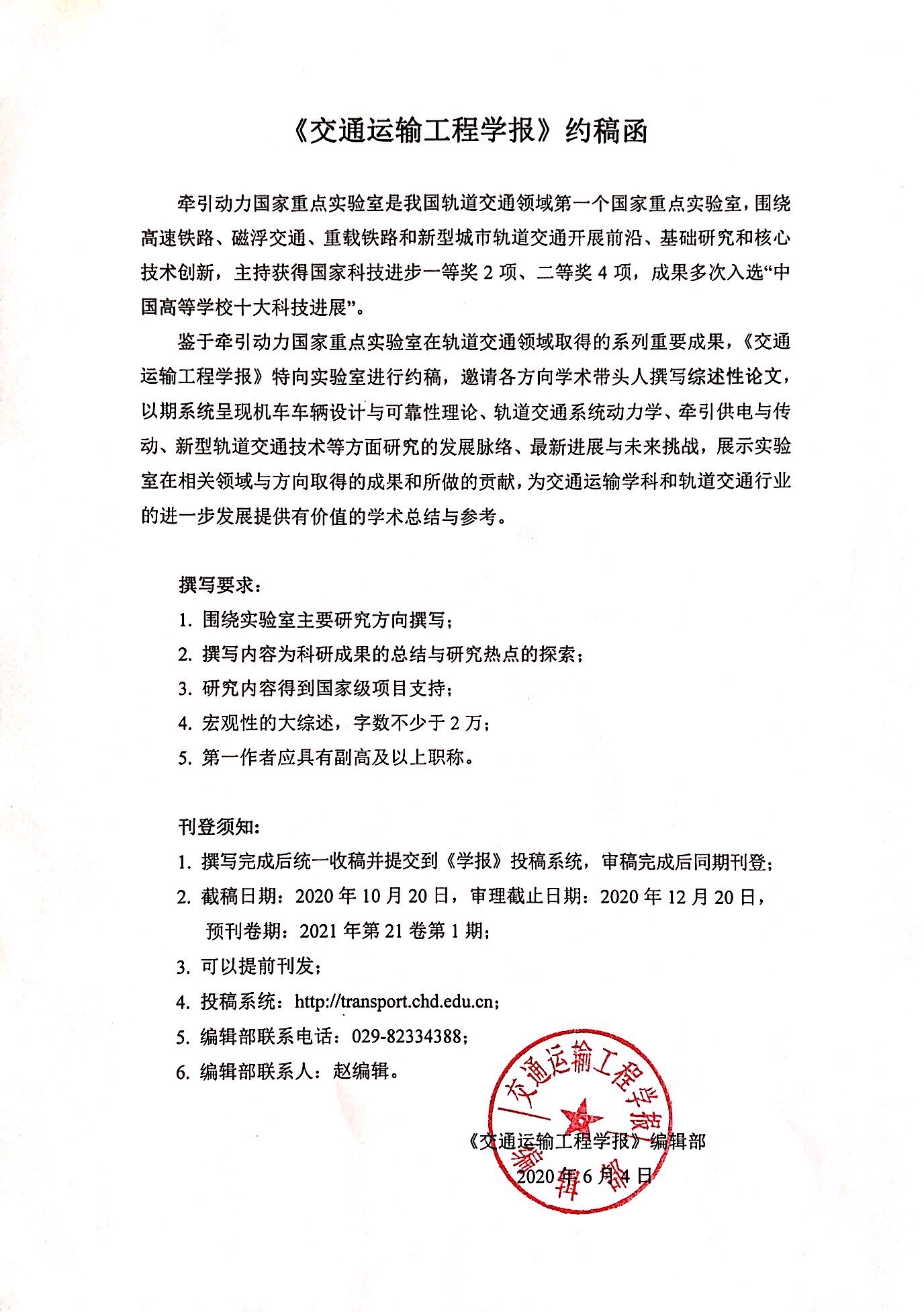 各位老师:《交通运输工程学报》现向实验室进行综述约稿(详见附图),有意向的老师请于6月15日前,将拟定的文章题目发送给姜雪娇老师汇总([email protected]),后续具体撰写事宜将由实验室组织商讨和推进。