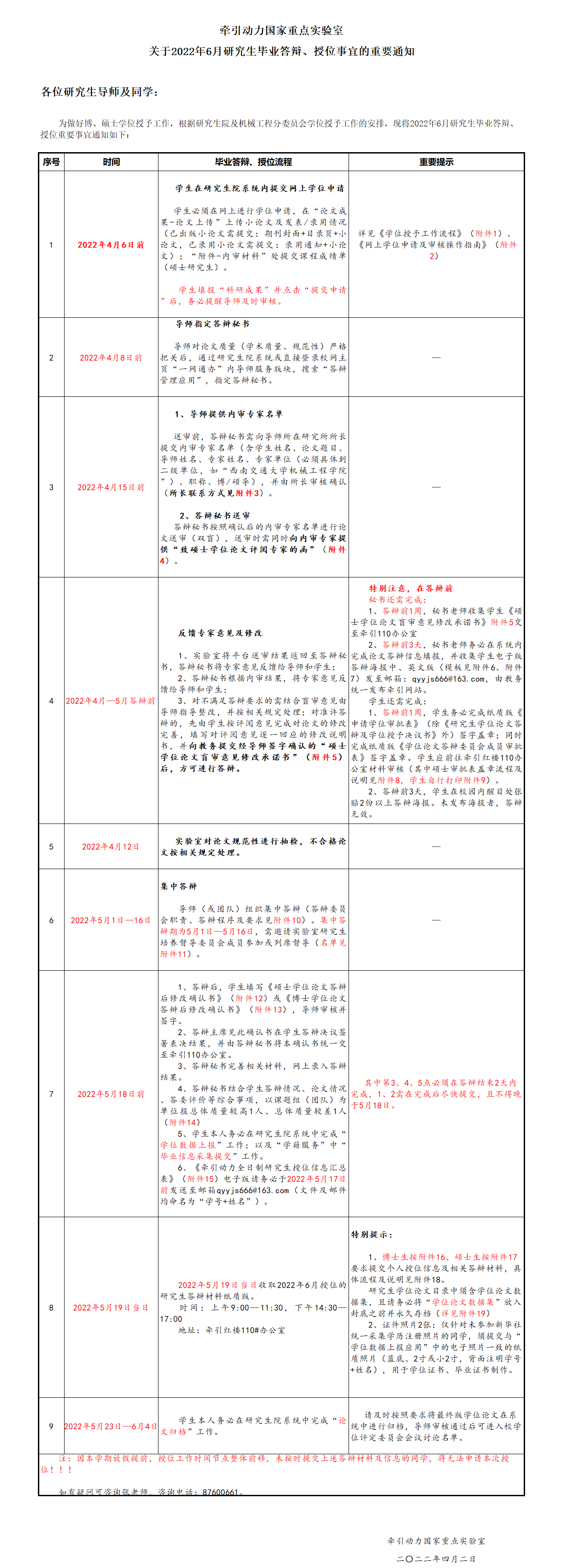 牵引动力国家重点实验室关于2022年6月研究生毕业答辩、授位事宜的重要通知