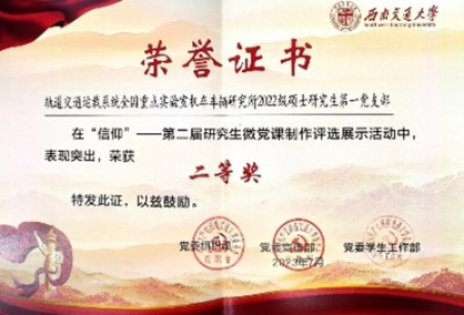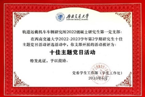 团支部工作效果显著。2023学年累计开展党团活动20余次,学习强国积分超17万分,立项校级示范主题团日活动1次,获得暑期三下乡优秀实践团队。协助班级和机车车辆所2022级硕士研究生第一党支部获忠忱班集体、PADP优秀建设案例、研究生信仰微党课评选展示二等奖等奖项。