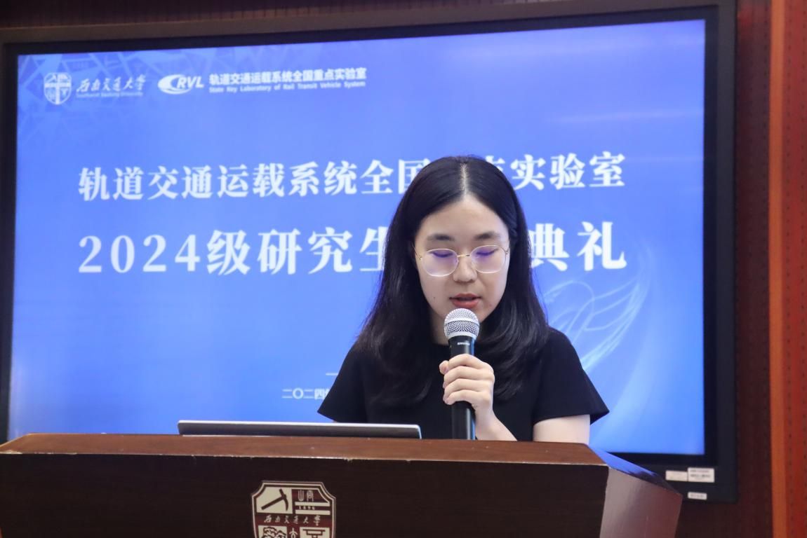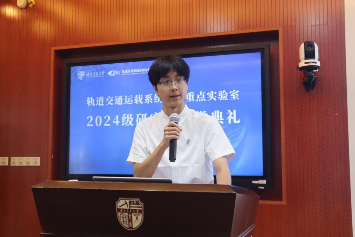实验室2024级新生代表张帆同学发言,他呼吁同学们一起努力,发扬“竢实扬华,自强不息”的交大精神,成为德才兼备、面向未来的创新人才,为轨道交通事业贡献自己的智慧和力量。