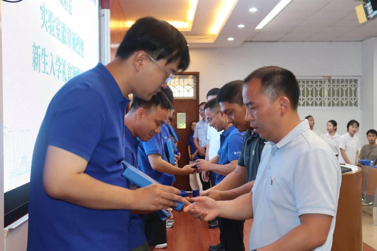 随后进行了实验室徽章颁授暨新生入学礼盒颁赠仪式。实验室领导及教师代表为上台的学生代表佩戴实验室徽章,台下的同学则自行将徽章佩于胸前。