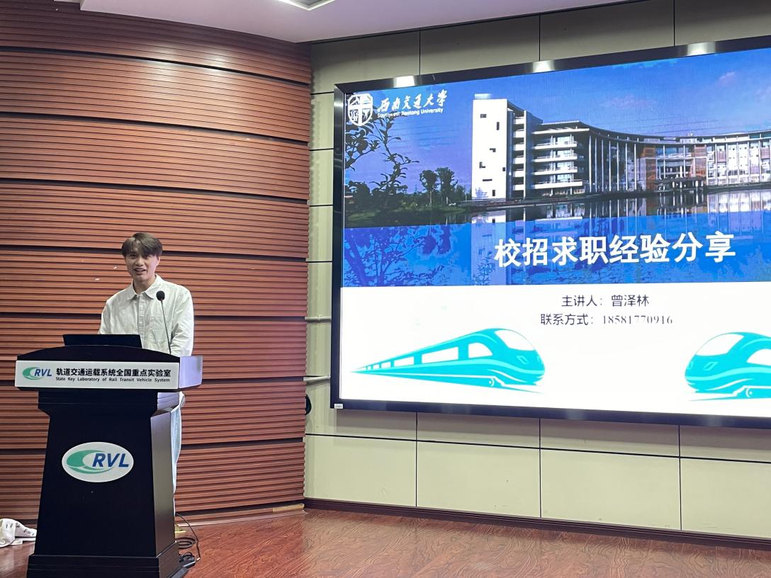 随后曾泽林开展主题为校招求职经验的分享。2025届毕业生曾泽林签约了株洲时代新材料科技股份有限公司。他从研究生求职者视角出发,为同学们讲解了秋招时间节点,提醒求职者在秋招之前要做好充分的准备,然后讲解了不同企业之间应聘与面试心得。他说:“希望各位同学能把握好秋招各时间节点并从实际出发做好相应的准备。”
