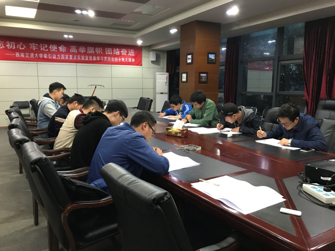 学期过半,牵引17级2班党支部组织了一次党建考试。在支部书记的严格监督下,每位党员同志们都认真地答题。党建试卷中还涉及了刚结束的十九大内容,比如:“中国特色社会主义进入新时代,我国社会主要矛盾已经转化为人民日益增长的美好生活需要和不平衡不充分的发展之间的矛盾”等。