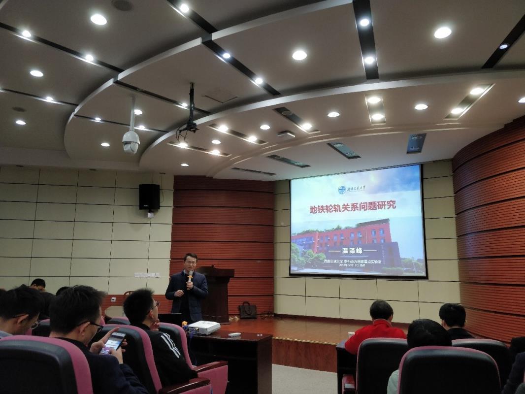 随后,代表团一行来到了牵引红楼218小礼堂,温泽峰副主任首先为大家介绍了实验室的领导班子、学生、实验室分布等情况,随后温主任针对地铁运营中的轮轨关系问题向代表团进行了详细讲解,包括轮轨异常磨耗中的车轮踏面磨耗、轮轨接触表面非均匀磨耗、钢轨波磨等问题。最后温主任对轮轨关系未来发展提出了他自己的三点意见:首先,车辆轨道应作为一个整体来设计,尤其是轮轨关系;其次,基础检测设计需要加强,如镟轮、钢轨打磨等检测;再次,维修策略需加强。在温主任的讲解下,代表团一行纷纷表示此次访问收获颇丰,尤其对轮轨关系方面收获更多。