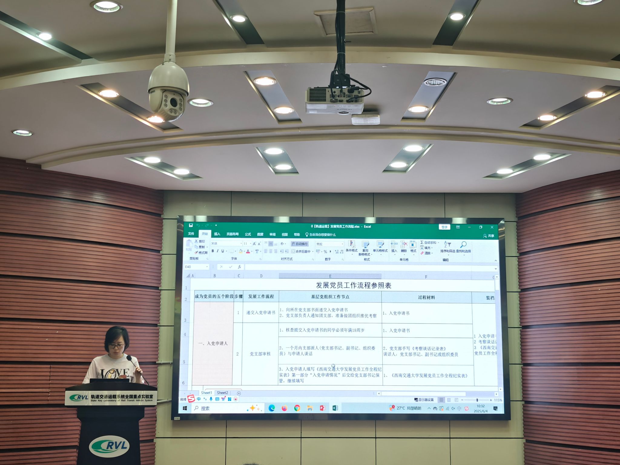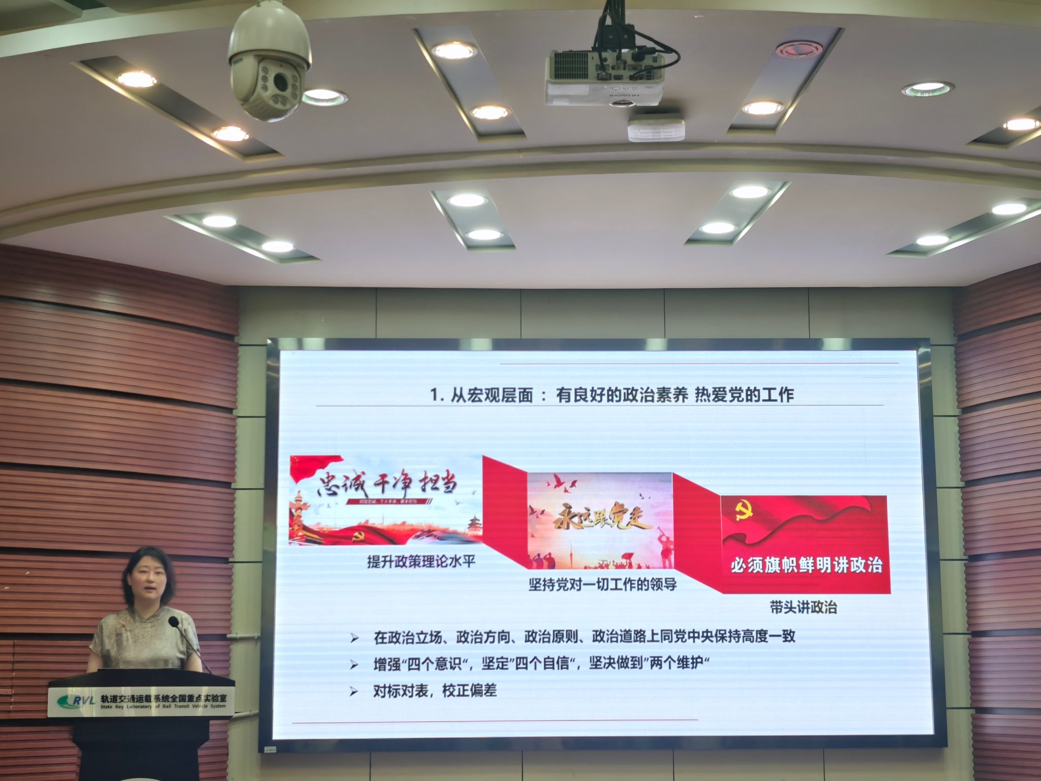 余卉老师的培训内容则聚焦支部建设实操层面,提出“既要规范夯基,更要特色赋能”的双轮驱动理念。她要求严格落实“三会一课”制度,确保党员大会每季度、支委会每月定期召开,特别建议主题党日可与实验室承担重大科研项目深度融合;在组织管理方面,明确支委换届须由纪检委员全程监督,工作记录实行“一会一档”闭环管理。“支部工作手册不是记事本,而是战斗堡垒的施工图。”余卉老师举起规范手册向大家展示,并提出具体要求。她最后号召支委当好“党建+科研”品牌的铸造者,将实验室的政治优势转化为服务交通强国战略的实践成果。