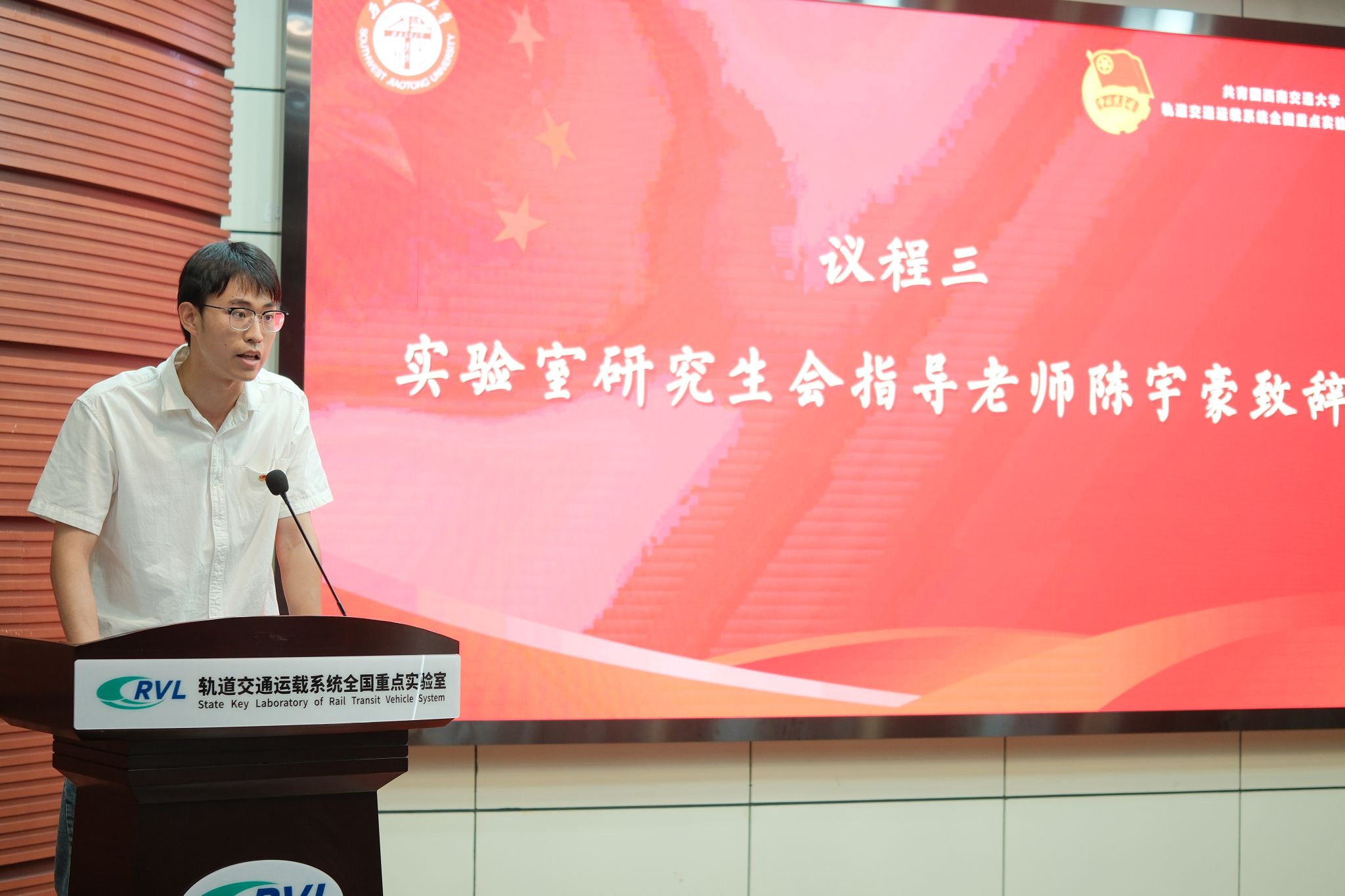 本次会议在庄严的国歌声中拉开序幕。会议伊始,实验室团委副书记陈宇豪致辞。他向大会的顺利召开表示热烈祝贺,对研究生会在学校与实验室发展中发挥的重要作用给予高度评价,并对研究生会全体成员提出了三点希望:一是持续深化改革,加强自身建设;二是真心履职尽责,服务青年发展;三是勇担时代使命,发挥先锋作用。