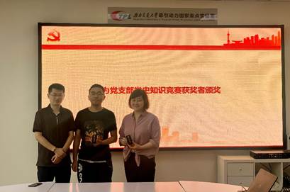 接下来,李奕潇同志介绍了“五四运动”及马克思主义在中国传播的背景与历史事件。随后,各位党员同志接力朗读了相关材料,包括“五四运动”的由来、马克思主义在中国的传播、《庶民的胜利》演说和《湘江评论-创刊宣言》等的重要章节,加深了各位党员同志对“五四运动”期间重要革命人物及关键历史节点的印象及体会。接着,各位党员同志通过手机小程序参与了党支部书记李奕潇同志精心准备的在线党史知识小竞赛。为激励大家更好的开展学习,李奕潇同志还特地准备了印有学校标识的书签和钥匙扣作为奖品。各位党员同志积极参与,最终耗时半小时,支部党员袁站东、周鹏、余卉分别获得了前三名,由党支部书记李奕潇同志为获奖同志们颁奖。