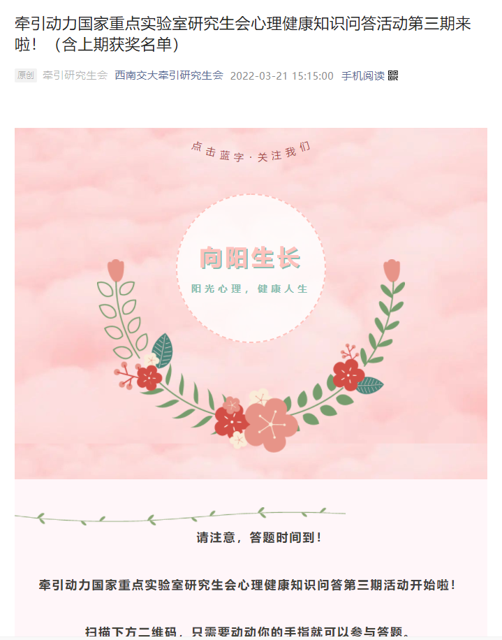 牵引动力国家重点实验室充分运用研究生会新媒体平台、结合网络资源,在3月11日-4月3日期间,面向全体研究生开展了为期4周的线上心理知识有奖竞答活动,共分为4期,每周统计成绩,根据答题成绩选取1名一等奖、3名二等奖、10名三等奖。答题内容既涉及“抑郁症”“焦虑症”“互联网综合症”等同学们感兴趣的心理问题的识别与预防方法,又有缓解压力、改善人际交往、正念学习的实用小技巧。