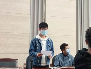 会议第三项是学生代表做出承诺发言。他谈到,针对当前的严峻形势,身为班生活委员(安全员)应以身作则,坚定承诺谨慎防骗、不贪图小便宜,并总结了一些诈骗常见套路以增强同学们的防骗意识。