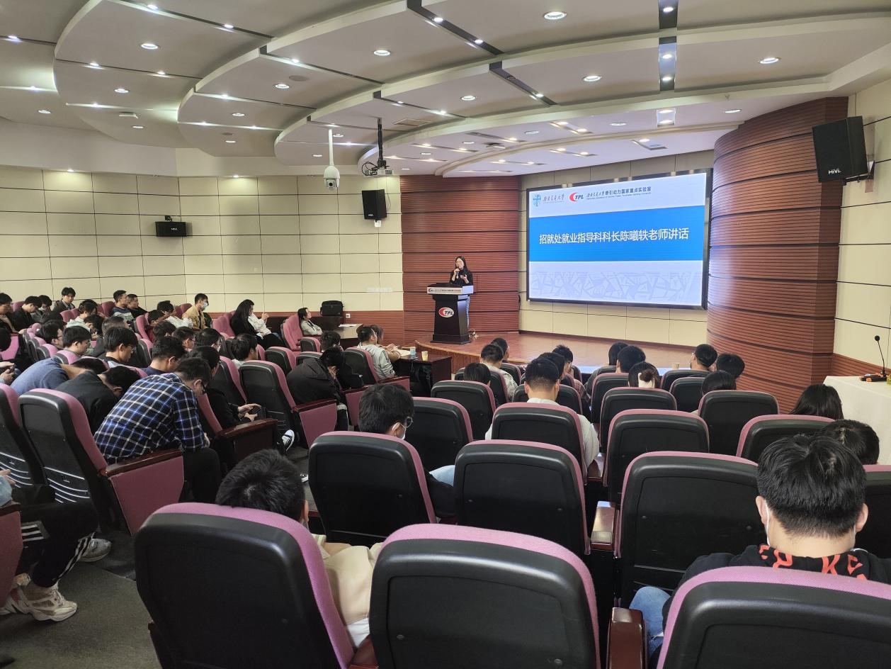 接着,辅导员奉明明对目前毕业生就业情况和就业形势进行了分析。奉老师结合用人单位发布的春招信息和我校春季校园招聘情况,介绍了就业形势以及校园招聘趋势,同时展示了牵引2023届硕士毕业生目前的就业具体情况,以此来帮助大家了解最新就业形势。