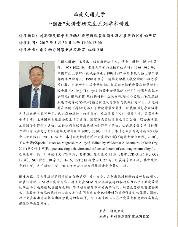 【学术讲座】超高强度钢中夹杂物对疲劳微观裂纹萌生及扩展行为的影响研究