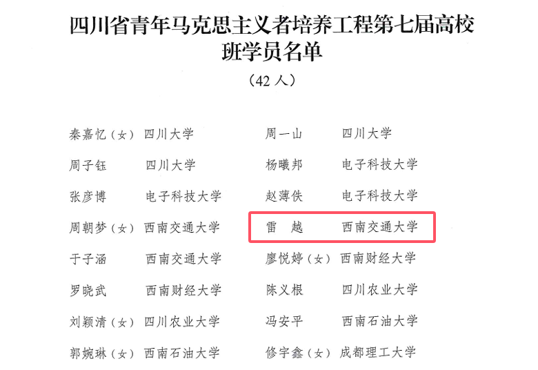 图1 实验室学子雷越入选四川省青马工程第七届高校班