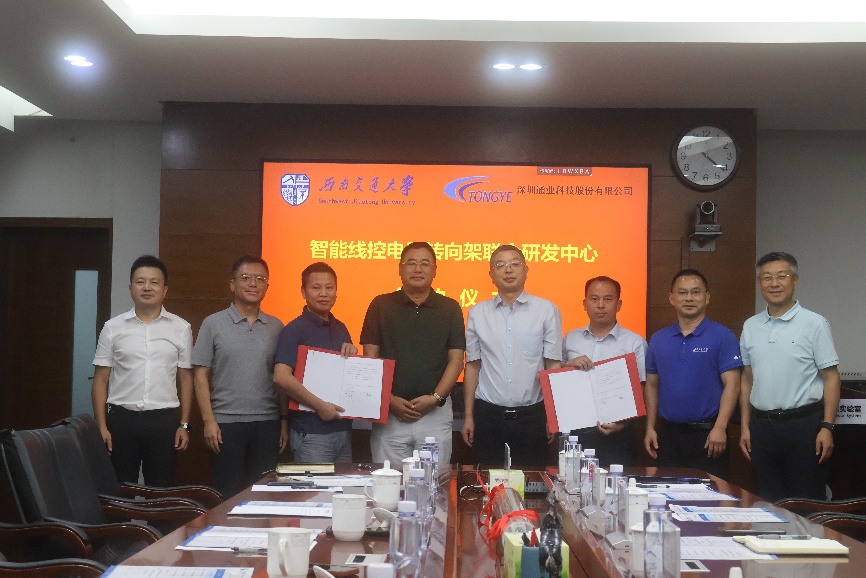与深圳通业科技股份有限公司在成都举行“智能线控电子转向架校企联合研发中心”签约仪式。深圳通业科技股份有限公司终身荣誉董事长徐建英、董事长闫永革、总经理刘涛、总工程师彭琦允、研究院院长谭诗干,爱爱啦