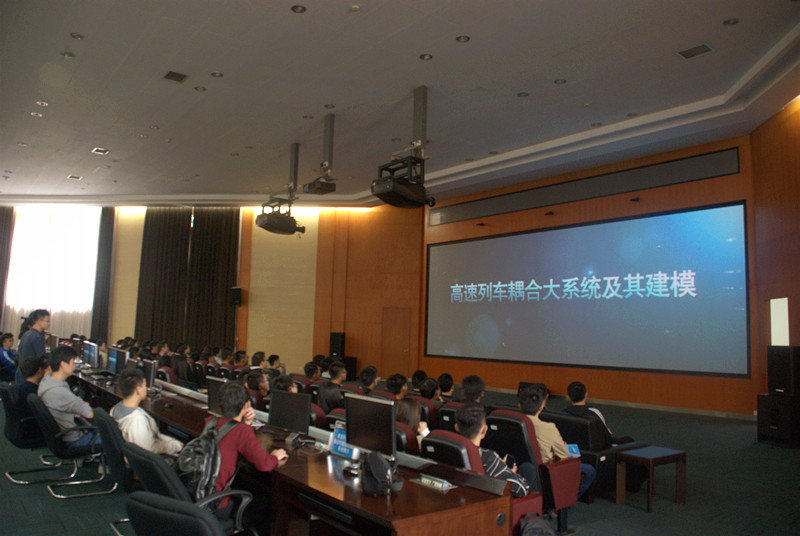 在工作人员的带领下,同学们参观了实验室大厅。厅内陈放着众多强大的试验手段和试验设备:包括处于世界领先水平的机车车辆整车滚动振动试验台、高温超导列车环形线路、弓网系统动力学性能模拟试验台、高速轮轨摩擦磨损试验台,车体疲劳试验台、轮轴疲劳试验台等一系列试验平台。同学们边参观边提问,讲解员耐心地解释试验平台的基本功能、运作条件以及科研现状等情况。