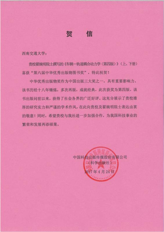 首席教授翟婉明院士的专著《车辆-轨道耦合动力学》(第四版)荣获“第六届中华优秀出版物图书奖”一事表示祝贺。 中华优秀出版物奖作为中国出版三大奖之一,具有重要影响力。
