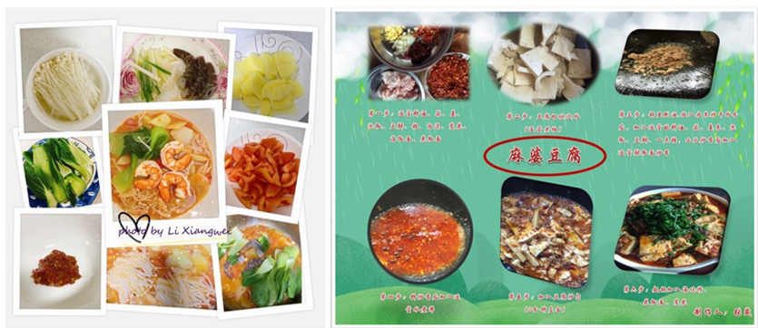 “因为学校离家较远,平时上班不是吃食堂,就是父母在家做饭,即便偶尔自己做,做得也很粗糙。”张崴老师如是说。家里小孩平时爱吃经典川菜麻婆豆腐,自己在家做过几次,可孩子总是说不如饭店的味道好。这次厨艺比拼,张崴老师专攻麻婆豆腐,在网上搜索了制作流程,步步求精,终于做出了可口的味道。她说:“宅在家中和家人做饭,是平时忙碌生活里阖家少有的快乐”。