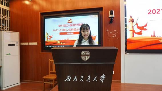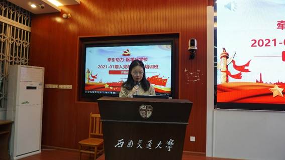 4月9日上午8:30,牵引动力国家重点实验室-医学院分党校(以下称牵引动力-医学分党校)在九里校区J4105隆重举行首期入党积极分子培训班开班仪式,正式启动积极分子培训工作。牵引动力国家重点实验室党委书记庞烈鑫、医学院党总支书记李锦红出席,开班仪式由牵引动力国家重点实验室党委副书记李莹主持。