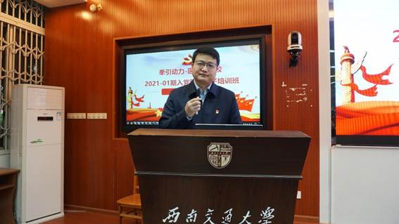 随后,牵引动力国家重点实验室党委书记庞烈鑫讲话。庞书记谈到,参加入党积极分子培训,是落实全面从严治党,提升党员质量,保持党员先进性的重要工作内容,也是在座各位同学政治生活中的一件大事。2021年是中国共产党成立100周年,是十四五规划的开局之年,也是学校奋力迈进世界一流大学的关键时期,希望通过本次培训,各位同学够全面深入的理解党的性质、领会党的纲领、学习党的纪律,端正入党动机,树牢“四个意识”,坚定“四个自信”,自觉做到“两个维护”。庞书记向全体入党积极分子提出三点学习建议:一是坚定信仰、端正态度,充分认识学习的重要性;二是勤学善思、学有所成,系统学习党的基本理论;三是严于律己、坚守纪律,确保学习培训取得实效。最后庞书记希望各位同学通过自己的刻苦努力,早日成为一名共产党员,为实现中华民族伟大复兴的中国梦不懈奋斗。