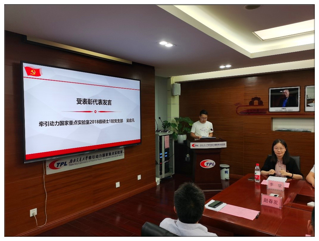 牵引动力国家重点实验室2018级1班党支部吴启凡作为受表彰党员代表发言。他首先代表2021届毕业生对实验室老师的辛勤付出和悉心培养表达了衷心的敬意,从思想政治理论提升、专业学习、科研实践和校园生活等多方面回顾了自己在实验室三年的成长经历,发自内心地感谢实验室对自己的培养、感谢老师对自己的教导、感谢同学对自己的支持和帮助,希望全体研究生能够积极拼搏、勇于奋斗,时刻铭记自己是牵引的一份子,时刻以作为牵引的一名毕业生感到光荣,同时也祝愿实验室发展越来越好。