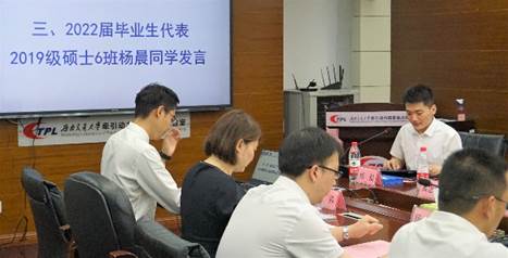 交流环节后,牵引动力国家重点实验室2019级硕士6班杨晨同学作为毕业生代表发言。他代表2022届毕业生对实验室老师们的辛勤付出和悉心培养表达了衷心的敬意,分别从思想政治素质、专业学习能力、科研实践素养和文化生活浸润等多方面回顾了自己在实验室的成长经历,希望全体研究生能够积极拼搏、勇于奋斗,时刻铭记自己是牵引的一份子,同时也祝愿实验室发展越来越好。