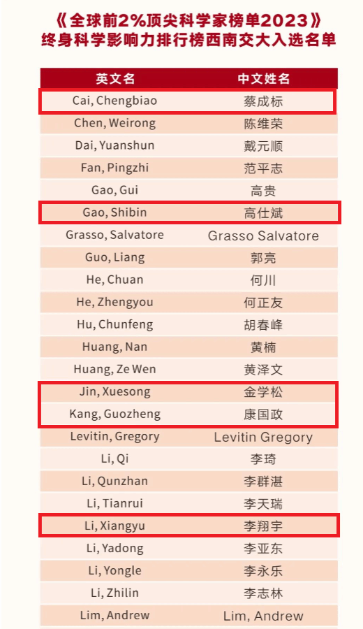 共有55位教师入选”终身科学影响力排行榜“,居全国第37位,其中实验室14位教师入选,分别为沈志云、翟婉明、张卫华、周仲荣、康国政、高仕斌、金学松、蔡成标、吴广宁、朱旻昊、张继业、李翔宇、邹喜华、宋文胜。