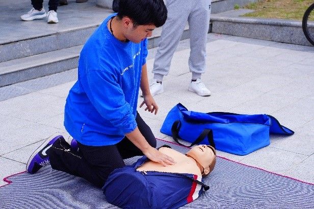 培训中李金权教官邀请学生展示消防器材的用法,邀请学生讲解灭火器用法,表示灭火器正确使用方法“提、拔、握、压”。他指出消防安全的三道防线为预警、灭火、逃生,火灾不可控时,应及时佩戴防毒面罩走消防通道逃离火灾现场。家里应常备消防设备有烟感器、灭火器、灭火毯及防毒面具。随后所有参会人员前往新大厅进行消防演练,李金权展示了灭火器的正确使用步骤、方法和灭火姿势,然后所有参会人员有序使用灭火器进行实操灭火。然后李金权指导各个参会人员进行心肺复苏实操。