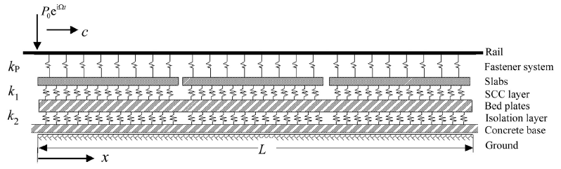 Fig. 1. A sketch of the slab ballastless track and the coordinate system. The two rails are represented by a single Timoshenko beam, and the slabs, plates and base by Euler-Bernoulli beams.