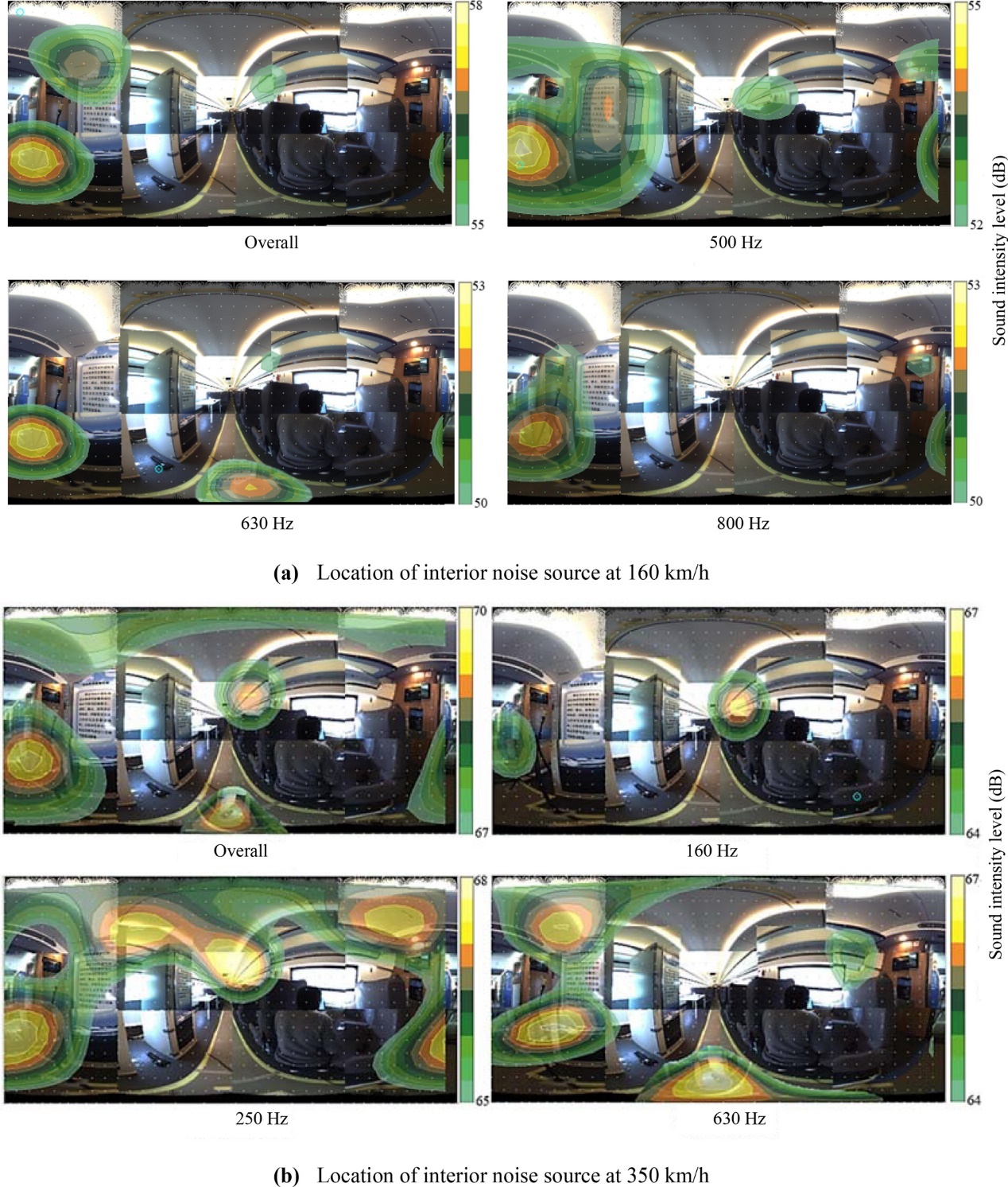 Fig. 5. Sound intensity maps of interior noise at 160 and 350 km/h.