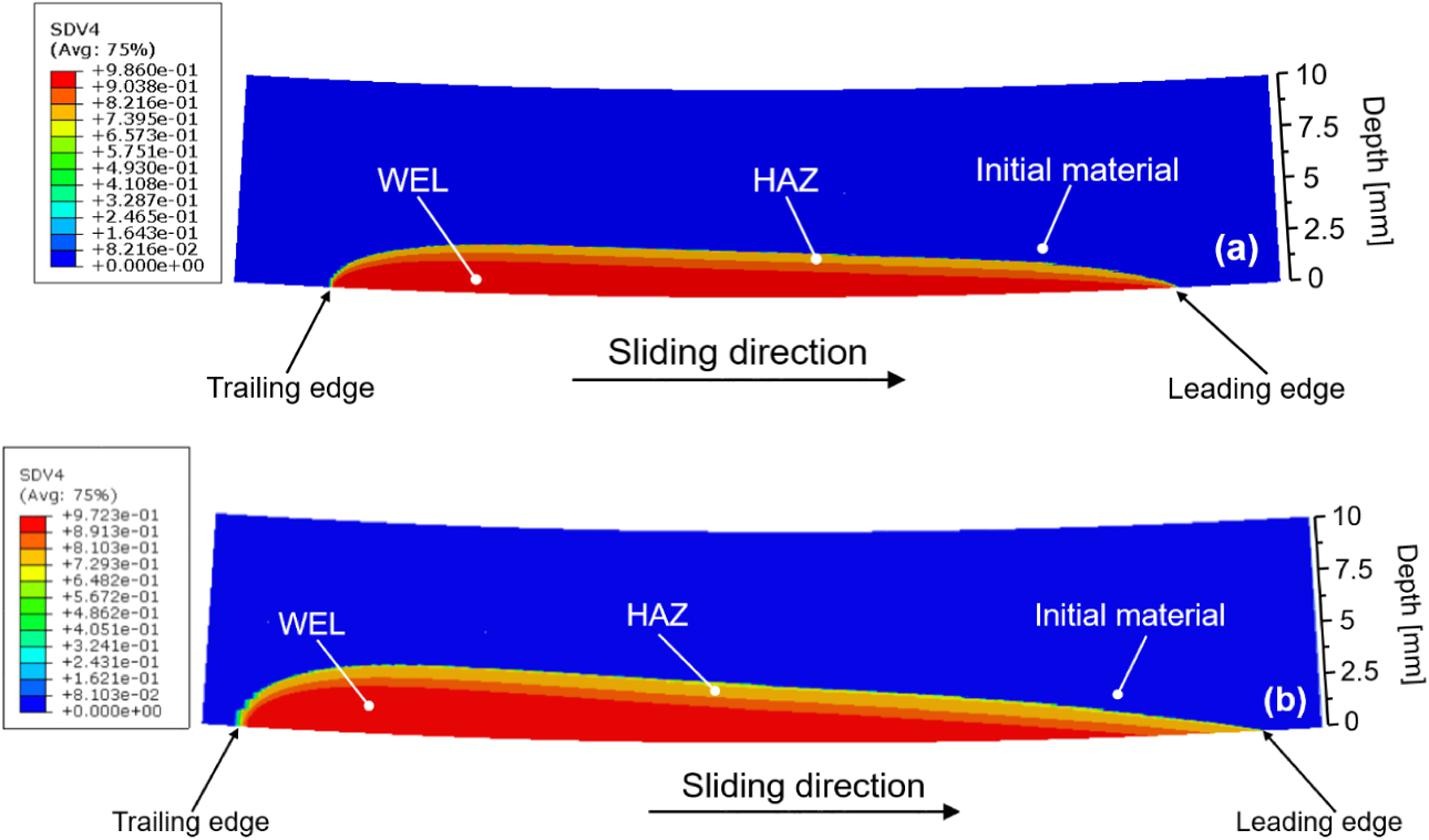 Fig. 5. Martensite distribution around wheel flat for ER8 steel. (a) Case 1 and (b) Case 2.