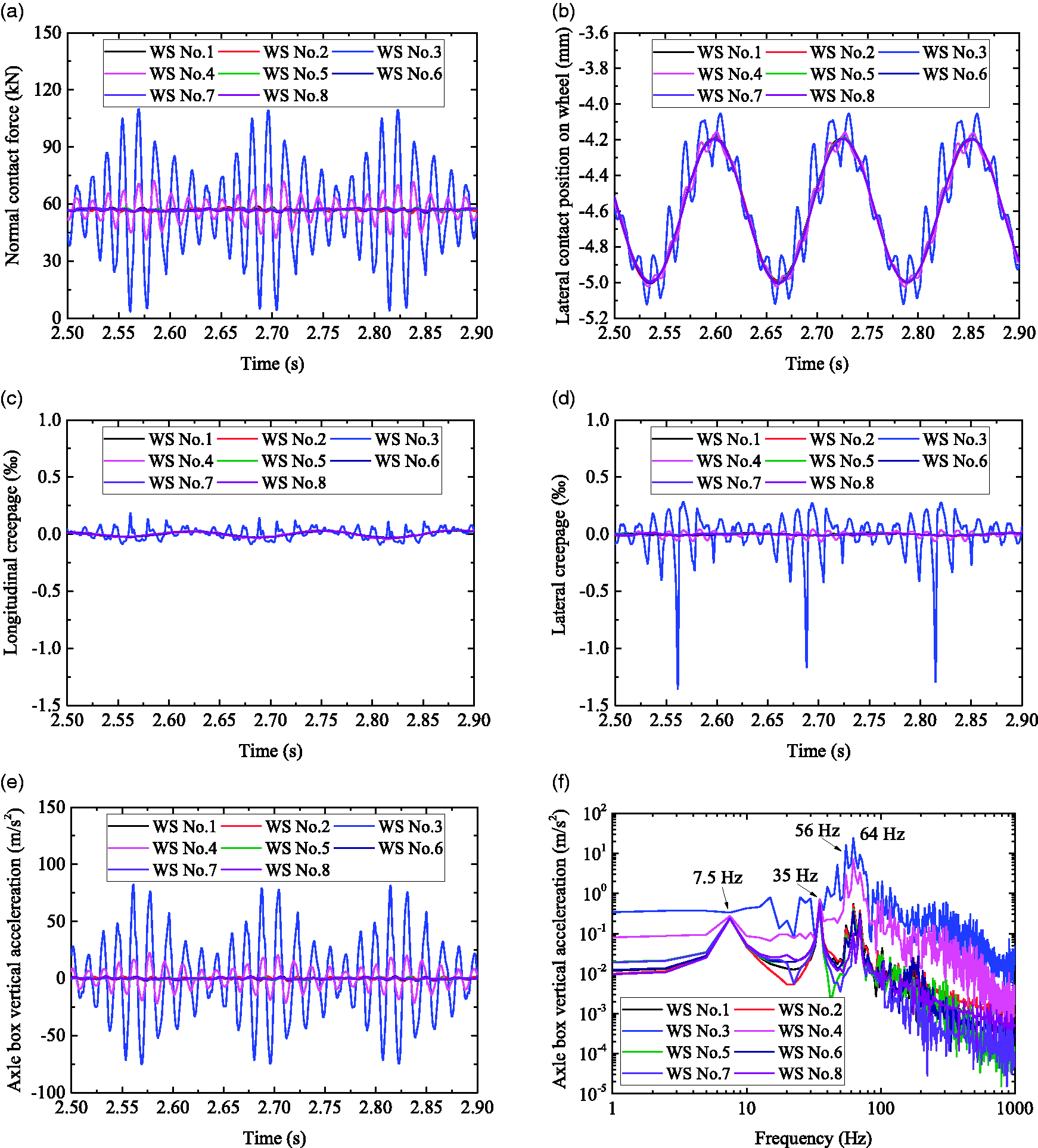 Fig. 10. Time history of (a) normal contact force, (b) lateral contact position on wheel, (c) longitudinal creepage, (d) lateral creepage, and (e) axle box vertical acceleration under excitation of low-order wheel OOR. (f) Frequency domain of axle box vertical acceleration..