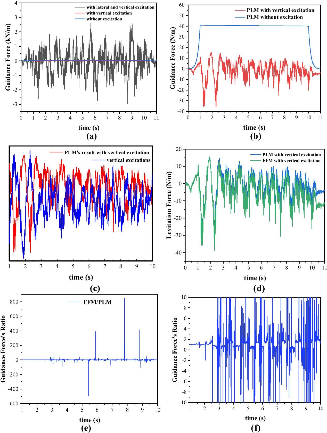 Fig. 13. Bulk’s guidance force. (a) PLM with vertical excitations. (b) PLM with vertical excitations compared with without excitations. (c) The trend comparison between the PLM’s result with vertical excitations and vertical excitations. (d) PLM and FFM with vertical excitations. (e) Ratio of FFM/PLM with vertical excitations during the working time. (f) Partial enlarged drawing.