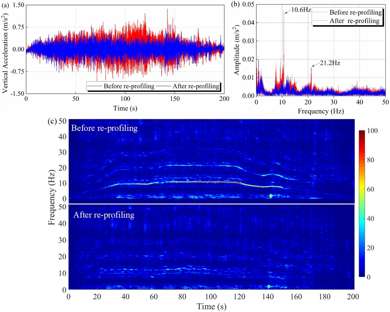 Fig. 14. Measured vertical car-body accelerations before and after wheel re-profiling in (a) time domain, (b) frequency domain and (c) time–frequency domain.