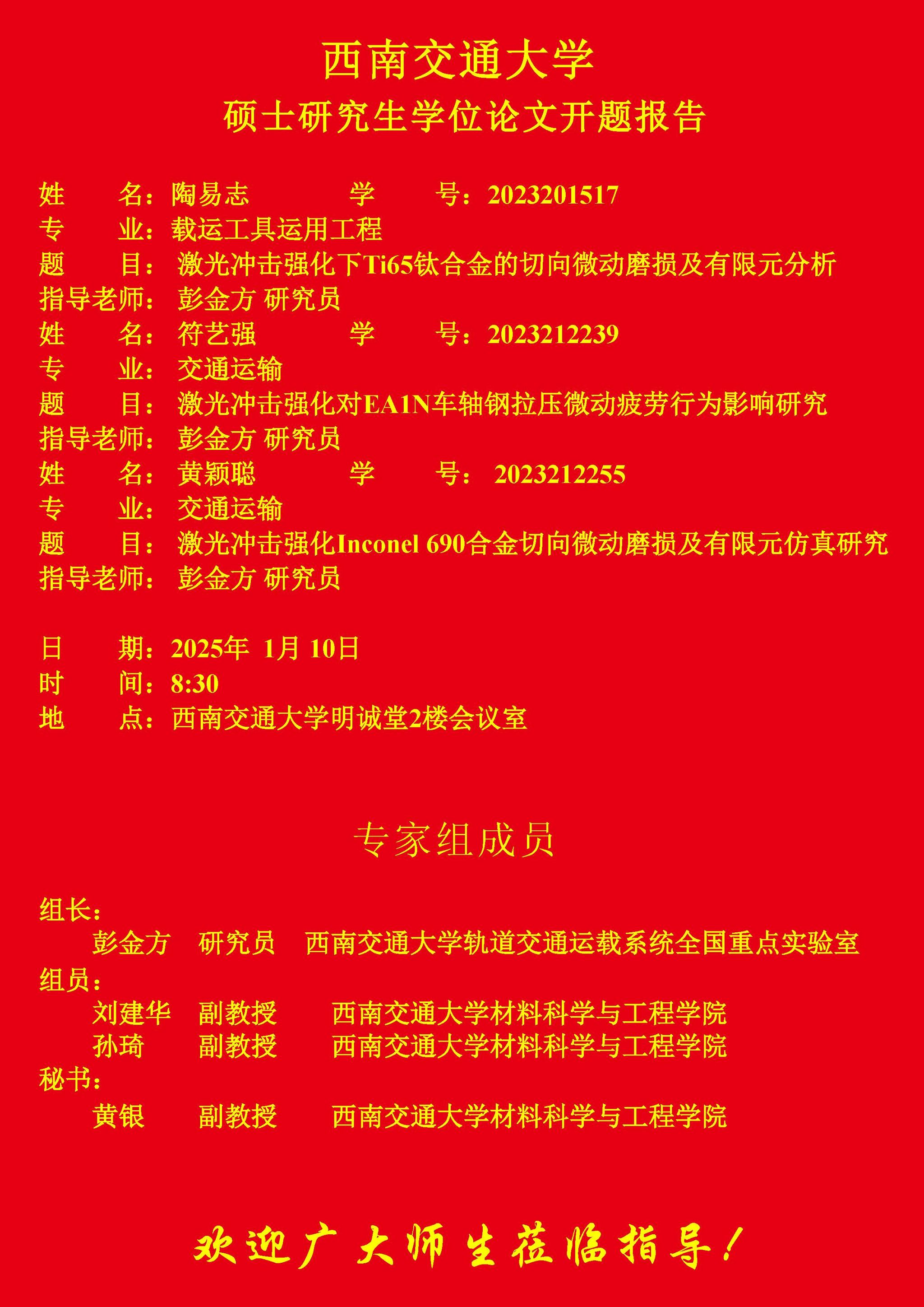 南交通大学陶易志、符艺强、黄颖聪硕士研究生开题报告