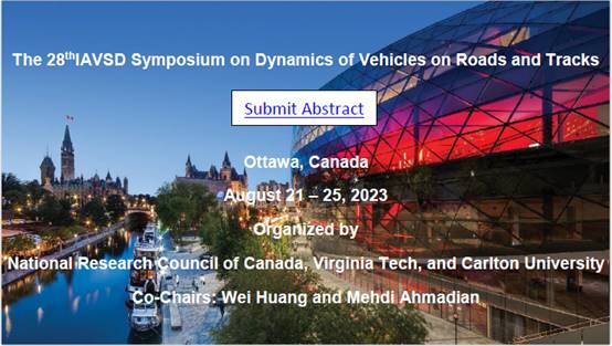 On behalf of the Symposium Organizing Committee, the International Scientific Committee, and the International Association for Vehicle System Dynamics (IAVSD), we invite you to attend the 28th IAVSD Symposium on Dynamics of Vehicles on Roads and Tracks in Ottawa, Canada on August 21 – 25, 2023. For further information, visit://iavsd2023.ca/
